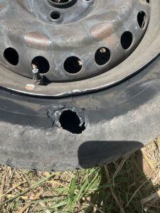 さて、腹ごしらえもしたところでビーチに行くぞ!と向かっていたら、「バン!!ガダダダダ!!」不穏な音と振動には気が付き、車を寄せて確認すると…