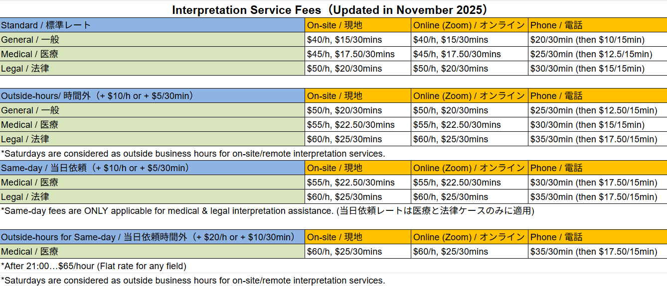 For Kanagawa areas, please be noted that distances will be based on each interpreter's location.